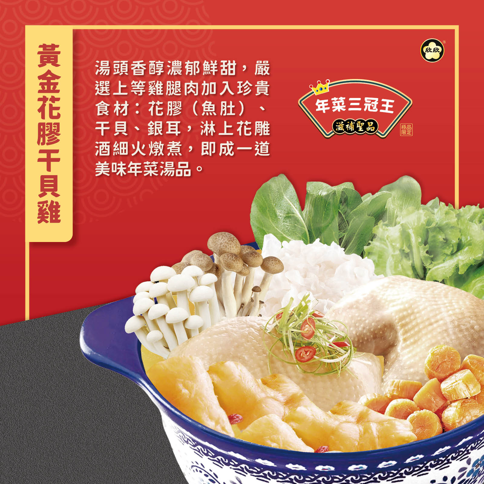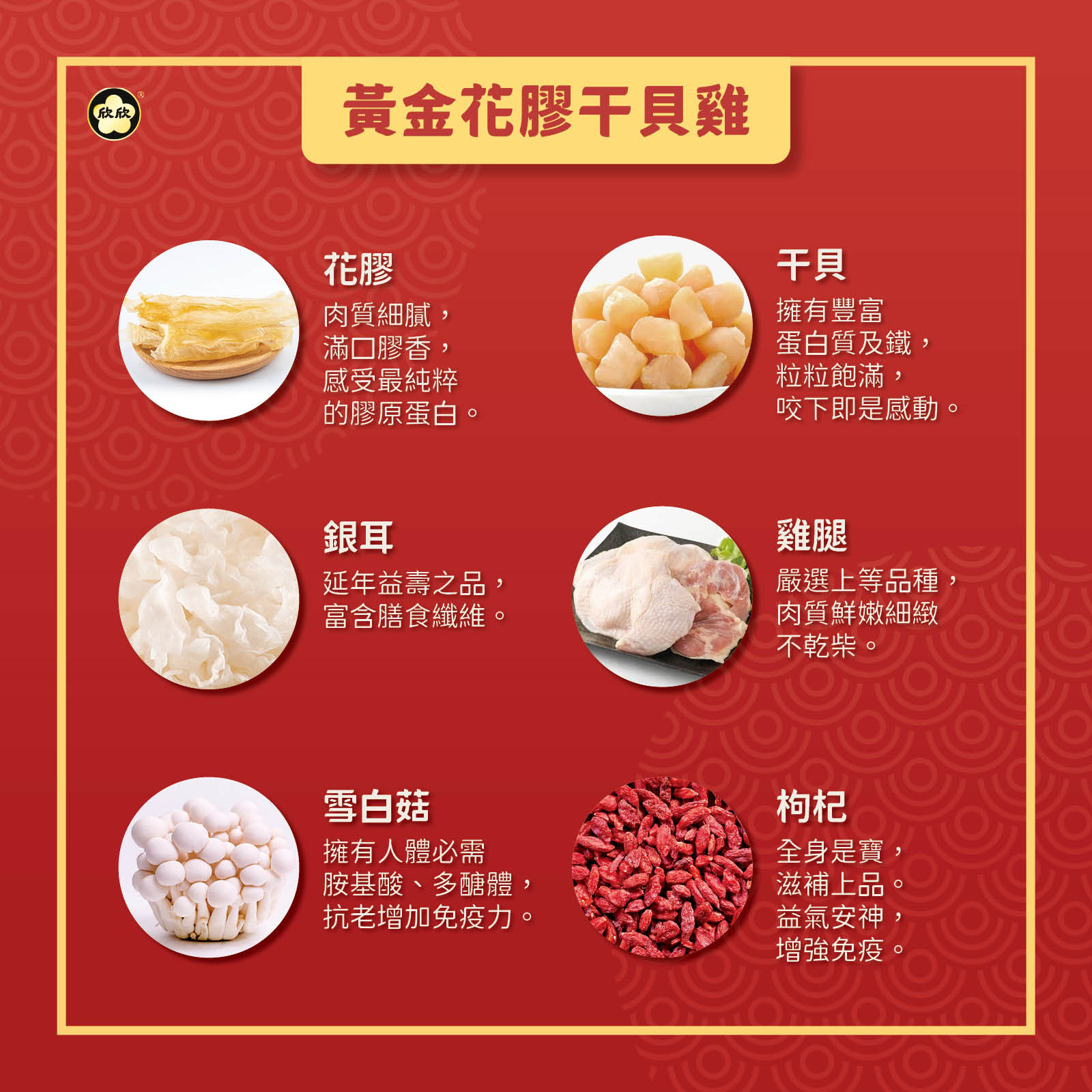 成分:水、雞腿肉、雪白菇、花膠雞湯醬〔水、老母雞、赤肉、鳳爪、排骨、鴨肉、豬肉、葡萄糖、鹽、豬肉精粉、小荳蔻、胡椒、雞油、胡蘿蔔、橄欖油、雞肉、雞骨、糖、雞脂、酵母、β-胡蘿蔔素、香料、L-麩酸鈉、5'-次黃嘌呤核苷磷酸二鈉、5'-鳥嘌呤核苷磷酸二鈉、琥珀酸二鈉、黏稠劑(玉米糖膠、醋酸澱粉)〕、白木耳、花膠高湯粉〔雞肉萃取物、鹽、麥芽糊精、雞粉、水解植物蛋白粉(玉米)、葵花籽油、雞油、棕櫚油粉、糖、鹽、酵母抽出物、奶粉、南瓜粉、關華豆膠、白胡椒粉、薑黃粉、調味劑(胺基乙酸、DL-胺基丙酸、琥珀酸二鈉、5'-次黃嘌呤核苷磷酸二鈉、5'-鳥嘌呤核苷磷酸二鈉、L-麩酸鈉)、黏稠劑(羧甲基纖維素鈉)、著色劑(β-胡蘿蔔素)、香料〕、花膠(魚肚、水)、花雕酒、枸杞、干貝、海鹽。
